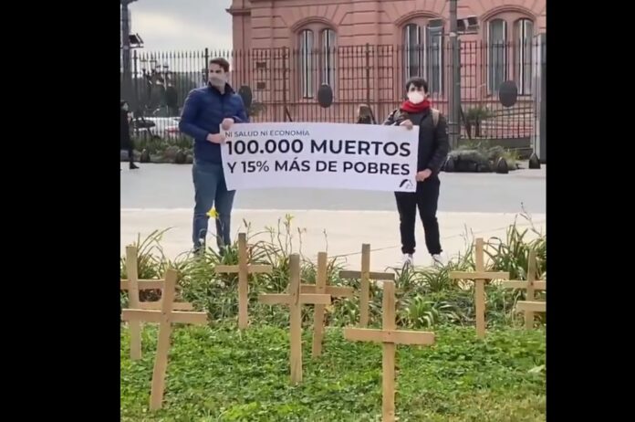 “Ni salud ni economía. 100 mil muertos y 15% más de pobres”. Un cartel con esa frase acompañaba a decenas de cruces y tumbas que colocaron la agrupación Jóvenes Republicanos frente a la Casa Rosada, luego de que la Argentina superara los 100 mil muertos por coronavirus.