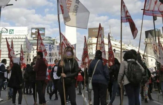 En el informe mostraron imágenes de la desconcentración de una movilización que se realizó en abril en San Miguel en la que una dirigente de la organización Clasista Revolucionaria divide a los manifestantes que participaron entre los que cobran y los que no. “Gente que cobra de este lado y los que no cobran del otro lado”, dice la dirigente que los va organizando en filas. La ayudan media docena de personas con pecheras de la organización que además les van tomando los datos.