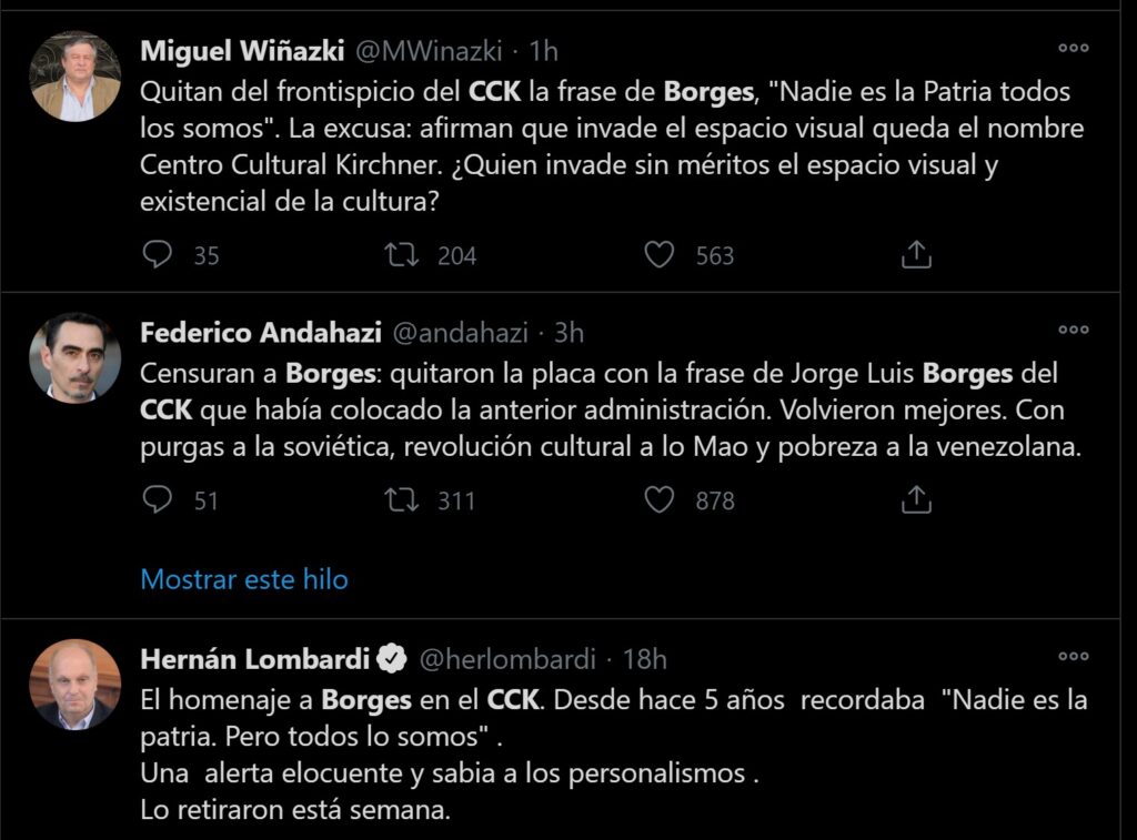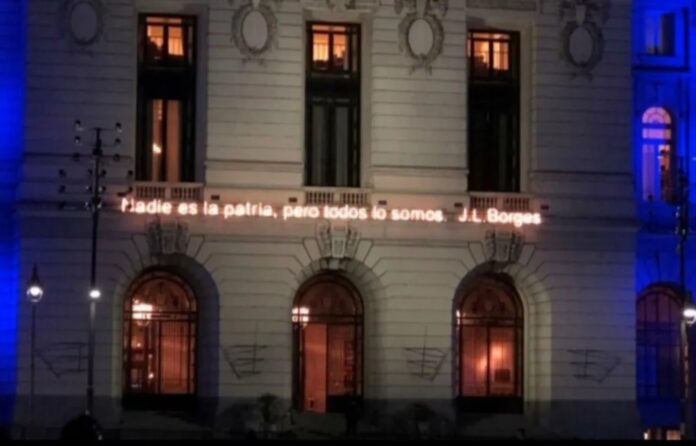 Una polémica decisión del Centro Cultural Kirchner generó indignación en miles de personas que se manifestaron en las redes sociales. Es que sin avisos previos, las autoridades optaron por retirar la frase de Jorge Luis Borges: “Nadie es la patria, pero todos lo somos”, la cual se observaba en un cartel iluminado en la fachada del edificio, uno de los patrimonios arquitectónicos más admirados de la ciudad de Buenos Aires