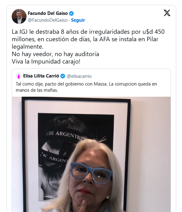 La respuesta oficial llegó luego de un duro posteo del legislador porteño de la Coalición Cívica, Facundo del Gaiso, quien acusó a la IGJ de destrabar “ocho años de irregularidades” y habló de impunidad. Ese mensaje citaba, a su vez, una publicación de la fundadora de la Coalición Cívica, Elisa Carrió, quien denunció un supuesto pacto entre el Gobierno nacional y Massa.