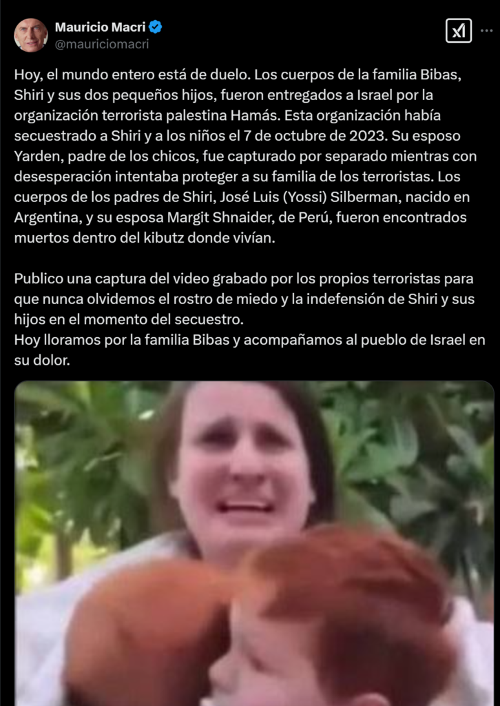 El ex presidente publicó un sentido mensaje minutos después de que el grupo Hamas entregara los cuerpos de cuatro rehenes muertos en la franja de Gaza. Tres de ellos pertenecen a los argentinos Shiri Bibas, sus hijos Ariel y Kfir.