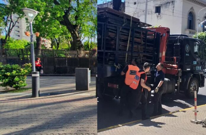 Horas antes de la protesta que se convocó para reclamar mayor seguridad en el municipio, la Plaza de San Justo fue vallada y generó bronca entre los vecinos.
