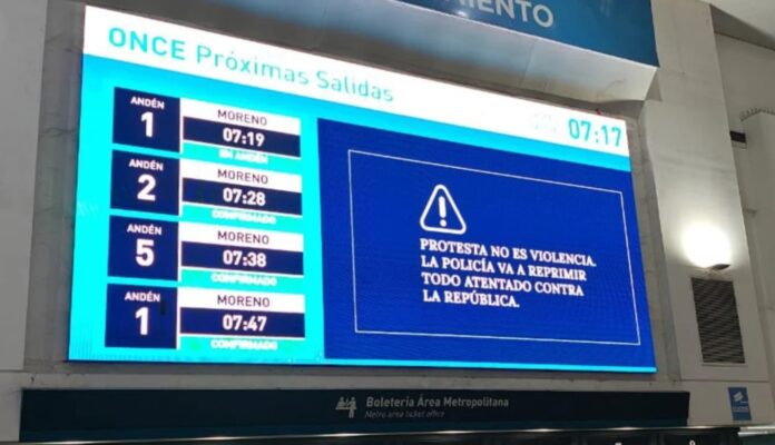 A pocas horas del inicio de la marcha de jubilados frente al Congreso, el Gobierno utilizó el sistema de comunicación de las estaciones de trenes del Área Metropolitana de Buenos Aires (AMBA) para enviar un mensaje disuasivo a los manifestantes. En las pantallas y altavoces de las terminales se proyectó la advertencia: “La policía va a reprimir todo atentado contra la República”, según pudo saber la Agencia Noticias Argentinas.