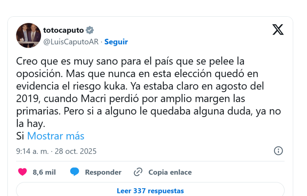 El ministro de Economía, Luis Caputo, se expresó en redes sociales este martes sobre el rotundo triunfo en las urnas del Gobierno y sostuvo que “en esta elección quedó en evidencia el riesgo kuka”. “La alternativa política no puede ser más el kirchnerismo”, lanzó el funcionario.
