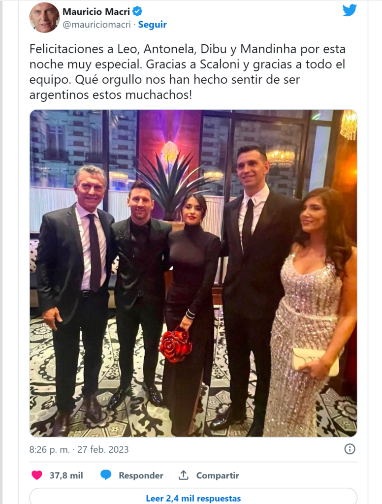 “Felicitaciones a Leo, Antonela, Dibu y Mandinha por esta noche muy especial. Gracias a Scaloni y gracias a todo el equipo. Qué orgullo nos han hecho sentir de ser argentinos estos muchachos!”, expresó el líder del PRO.