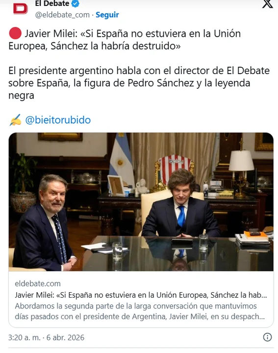 El presidente Javier Milei volvió a generar repercusión internacional tras una entrevista con el medio español El Debate. Allí, lanzó duras críticas contra el gobierno de Pedro Sánchez y trazó una comparación directa con la Argentina de los últimos años. “España va camino al kirchnerismo”, advirtió, en una frase que rápidamente cruzó fronteras.