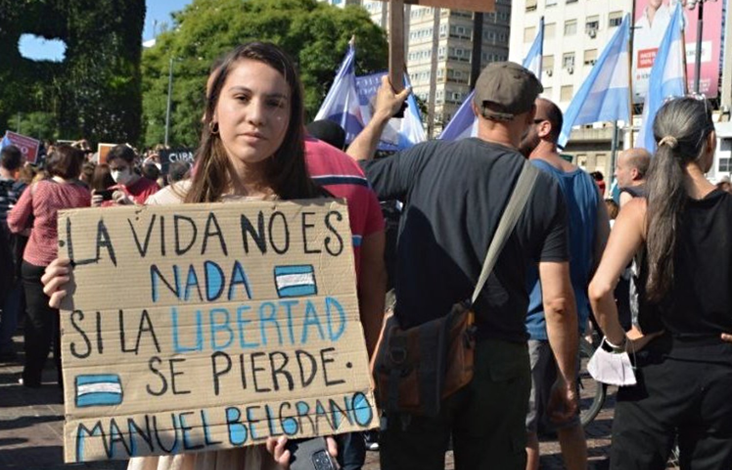 Los manifestantes marcharon gritando “libertad” y con una extensa bandera argentina por el centro de la Ciudad de Buenos Aires, pasaron por el Congreso Nacional y llegaron hasta el Obelisco con una gran pancarta que decía “Pase sanitario = Gobierno totalitario / Sin libertad no hay vida“.