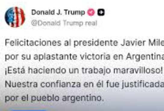 “Felicitaciones al presidente Javier Milei por su aplastante victoria en Argentina. ¡Está haciendo un trabajo excelente! El pueblo argentino justificó nuestra confianza en él”, resaltó Trump en sus redes sociales.